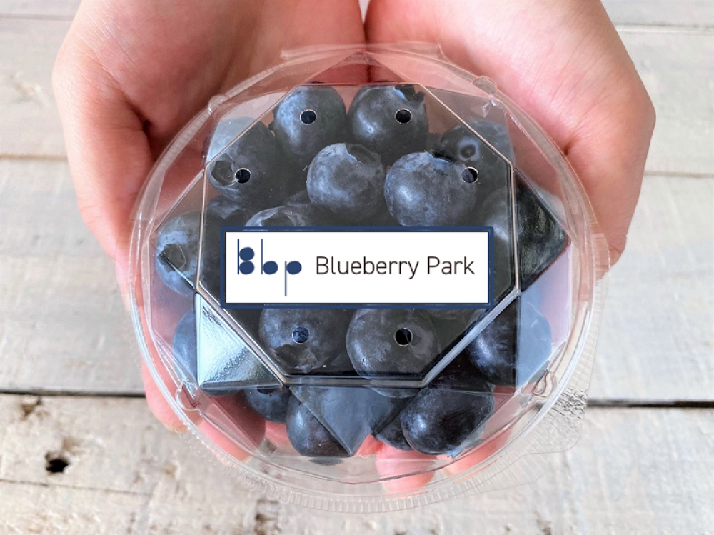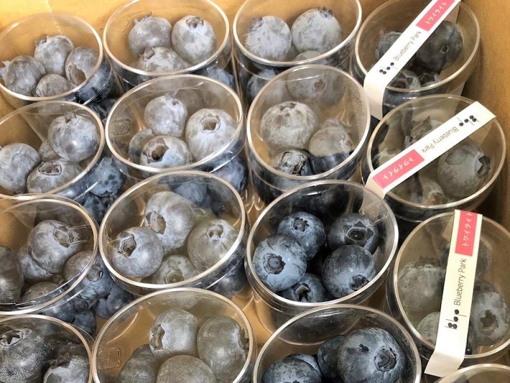 収穫したブルーベリーは選別してから出荷用のパックに詰めていきます。特大サイズのブルーベリーはお客様の目を惹きます。
