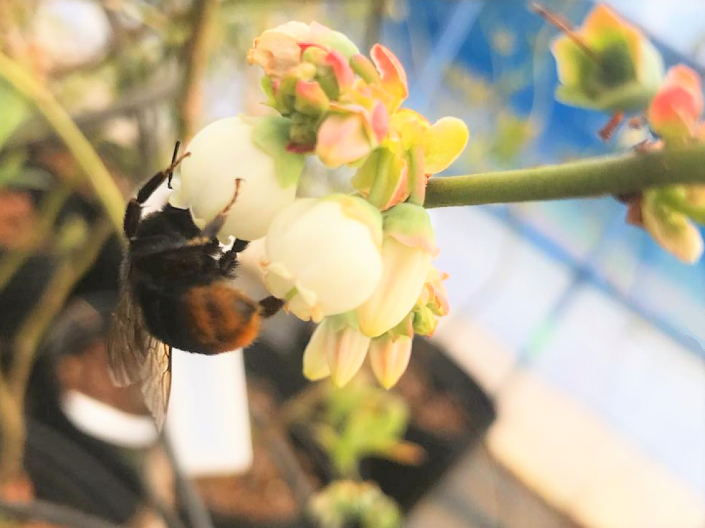 ハウス栽培のメリットは虫の混入が少なく、防虫のための薬剤や農薬の使用しない無農薬栽培が可能なこと。そんな中活躍してくれるのがこのクロマルハナバチです。ブルーベリーの実をつけるための大切な"受粉"の作業を担っている可愛い従業員です。