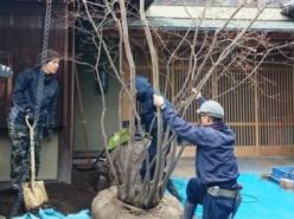 個人邸のお庭に木を植栽している様子です。当園では、お客様の植木を一時的にお預かりして管理することもあります。